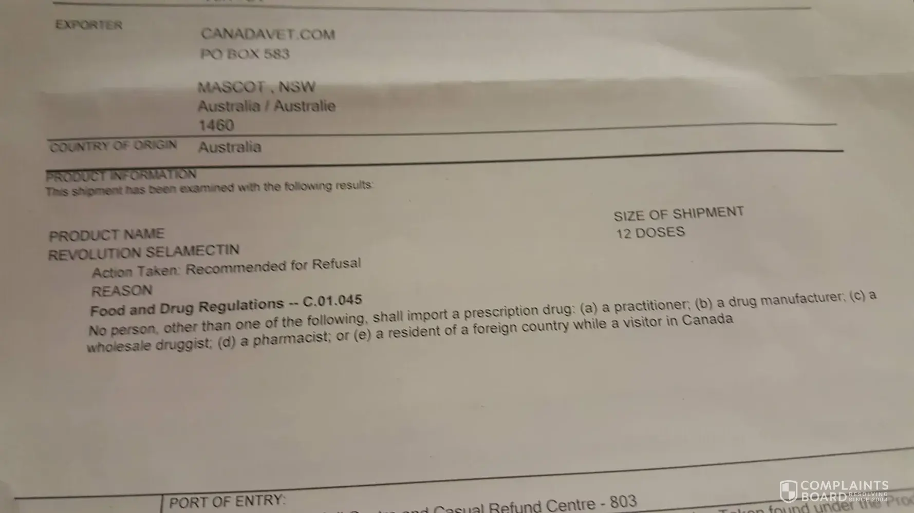 Paid $100 for tick medication from what I thought was a canadian vet supply distribution company. After consecutive messages over a two week period i find out that this company in fact ships from Australia and i can expect to wait over 30 days for my product to arrive. It hasn't arrived. I haven't been reimbursed for my loss of hard earned money. Sounds like something the better business bureau would be interested in.
