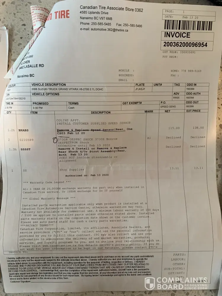 Schocks bought april 19, 2020. Leaking today with 09;30 appointment. They have the shocks in stock and it is 11;00 and my vehicle has been sitting up on the hoist since 0:915. No one is working on it. Canadian Tire Beacon Hill Calgary