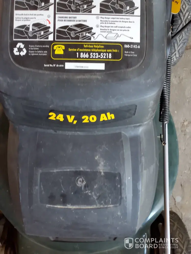 Bought this cordless self propelled lawnmower serial #CTN0680245, product # 060-2142-6 in mid summer of 2015, at Canadian Tire in Terrebonne Québec, for close to 500$. To function it needs a 24V 20Ah lead and acid battery.