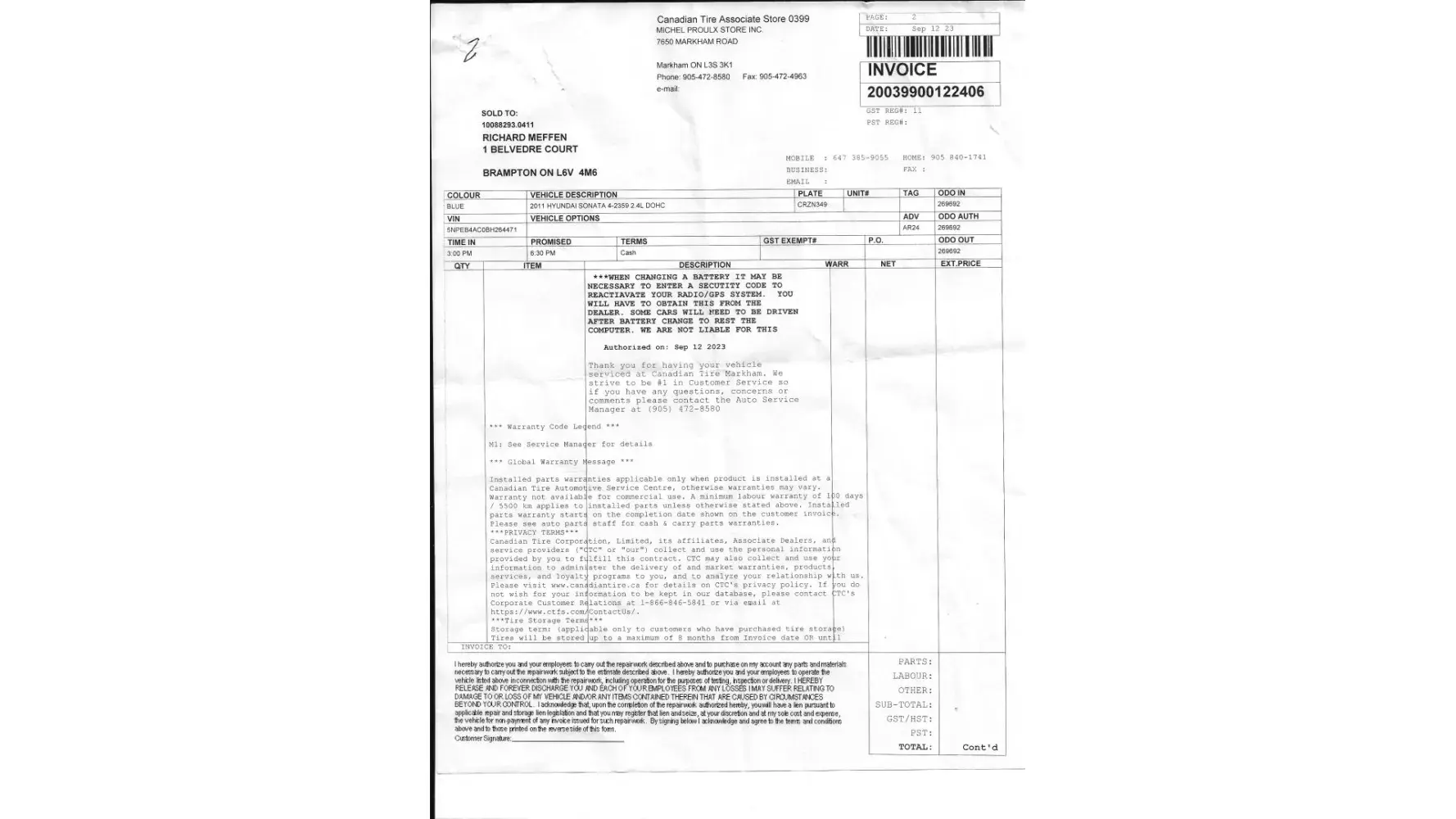 WAS in Toronto on September 12/23 when battery went dead. Got a boost and preceded to go home to Peterborough some 160 km away. We were on the highway when we pulled into the Markam store to get a Battery. The service man told us we would need a test and a battery. The Battery was $175.99 the test was $119.99, and the install of battery was $134.99. The technician came out to the service man and told him the battery was so sulfated and dead that the battery needed replacing before the test. The car was out of the garage within 15 min later. We received no test printout and were severely OVER CHARGED to replace just a battery.