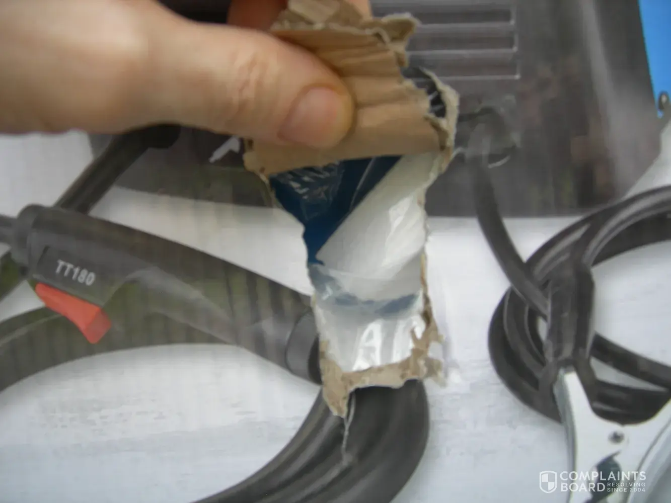 - There is a hole on the side of the box. They tried to cover the hole with the ripped cardboard.