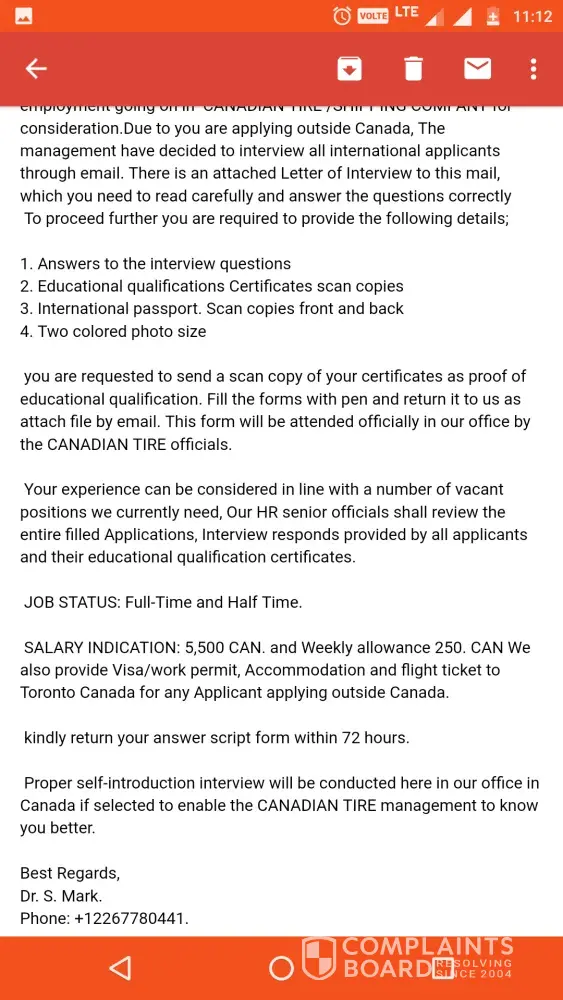 I want to know is this a real job offer or just a scam by a fake id or its a fraud . I am sending some images to you attached with this complaint please tell me as soon as possible beacuse as i went through the email they are saying that they will interview me.online and also they will conduct a self introduction interview in Toronto, Canada office if i will get selected it was sent by Dr. S.Mark with +[protected] this phone no. As they were also saying that it is a renewable 3year contract also they will provide visa/work permit, accommodation, filght ticket to Toronto and they included that the salary will be. 5, 500 CAD with 250 CAD Weekly allowance.. please let me know about this as soon as possible help me ...