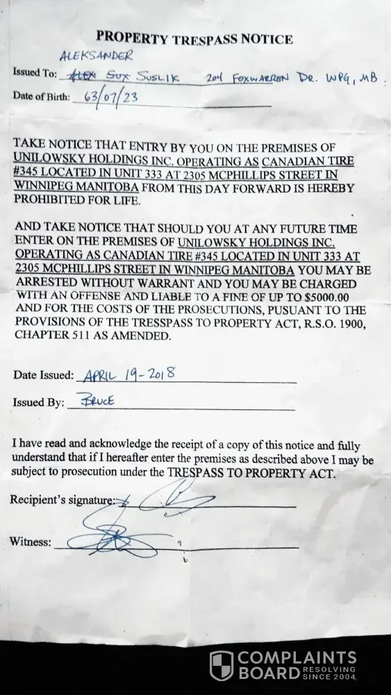 I asked to call police by myself right away. They said that they did call 911, however they lied, they never did because they knew there is nothing to proof by reviewing video recording. They forced me to sign "property trespass notice". If I have refused, Bruce promised to hold me overnight, no water, no washroom. He said: "You can pee in your pans". Realizing this mayhem is with complete support of the store manager, I went to police where I found they never called police.