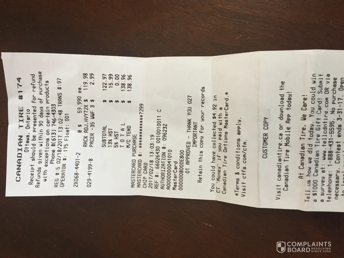 I went to Canadian Tire, and intended to change the both front break pads of my car on Mar 22, 2017 in the 3500 No. 3 Road, Richmond, BC.