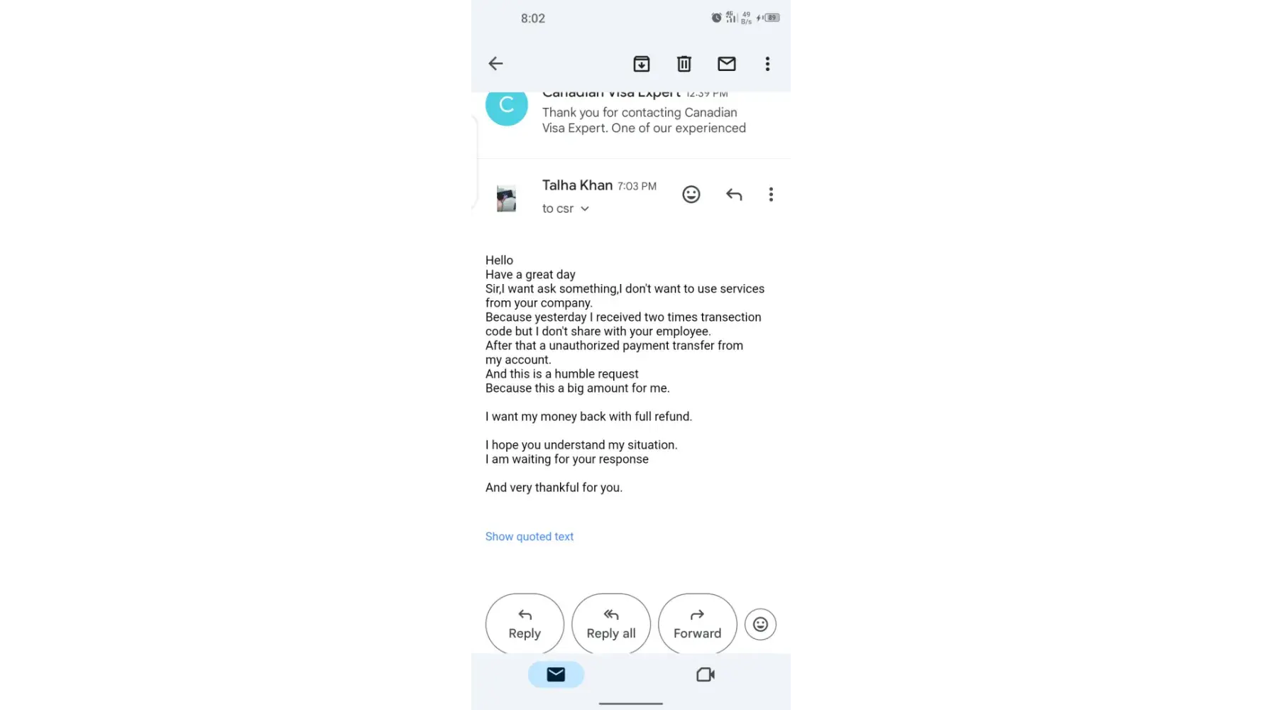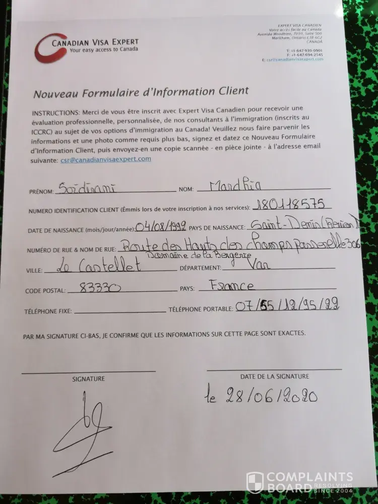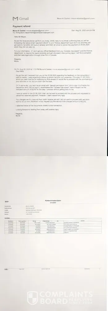 I realized afterwards that many people have been frauded in the same way by this business. I hope Complaint Board will be able to support me in getting a full refund for my unauthorized payment and that the matter will be dealt. I'm saddened that businesses like Canadian Visa Expert are able to exist and operate in Canada as they take advantages of people like me trying to come to Canada to have a chance to become exemplary and striving Canadian resident.