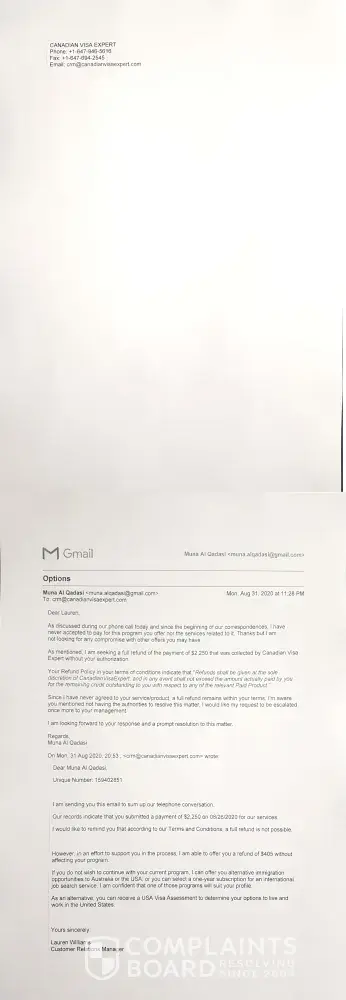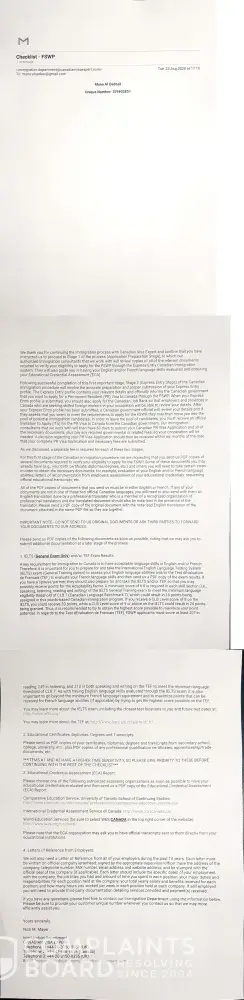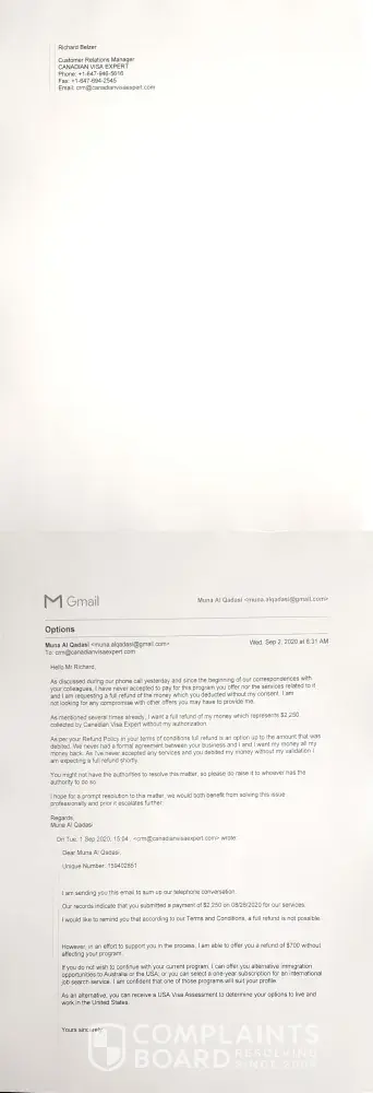 After contacting Canadian Visa Expert several times to resolve the aforementioned matter, I now take it to the Complaints Board to request support in resolving my case. I initially wanted to resolve this issue with the Canadian Visa Expert but being denied a full refund and offered less than 30% of what the company debited me I'm now escalating the case.