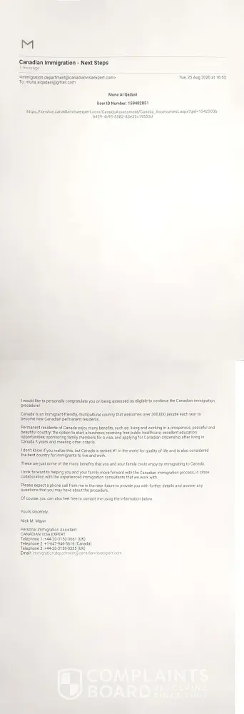 On Aug 25th 2020, I've received a call from a representative from the Canadian Visa Expert, his name was Mr. Nick M. Mayer (+1-705-995-3424). He introduced himself as a personal immigration assistant from Canadian visa expert and indicated that based on the information I provided in my application that I was eligible to apply for one of the Visa Skilled Based. He described the application and cross check some information with me and requested few additional details. He then provided a lot of information about the visa process which consists of 3 steps: (1) application preparation, (2) express entry stage and (3) application for PR Visa. The total cost was around 4, 750 USD. (1) 2, 250, (2) 500 (3) 2, 000.