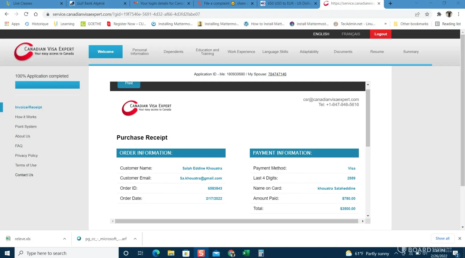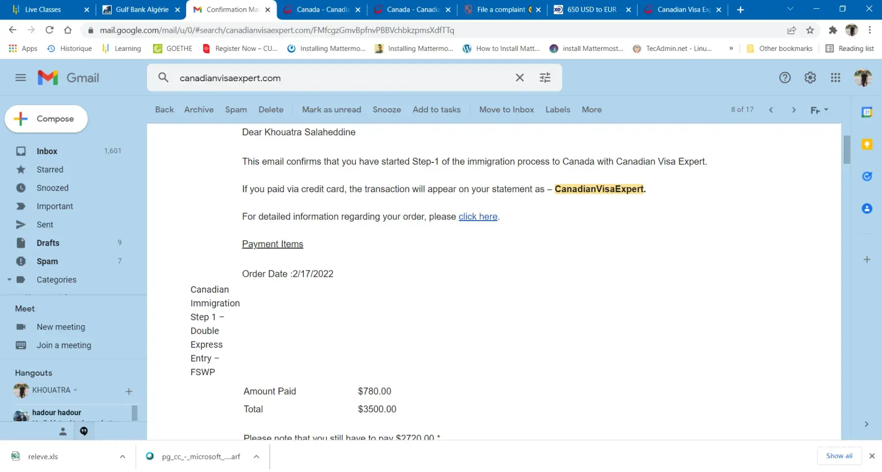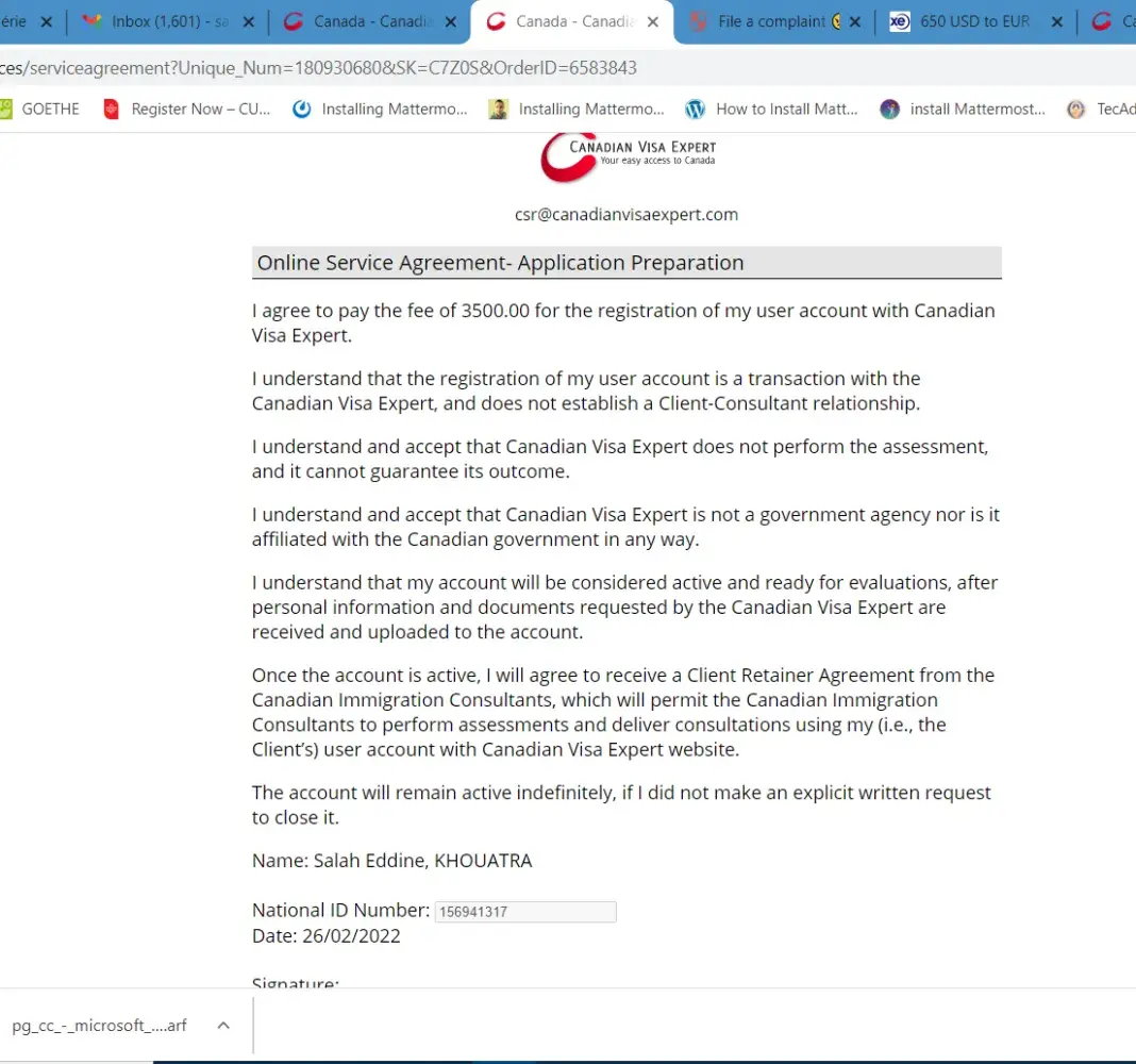 On the 13th and 14th February 2017, I paid 778Euros to Canadian Visa Expert, just after I filled an online assessment form for the Express entry system for immigration to Canada and I was deemed eligible by your company.