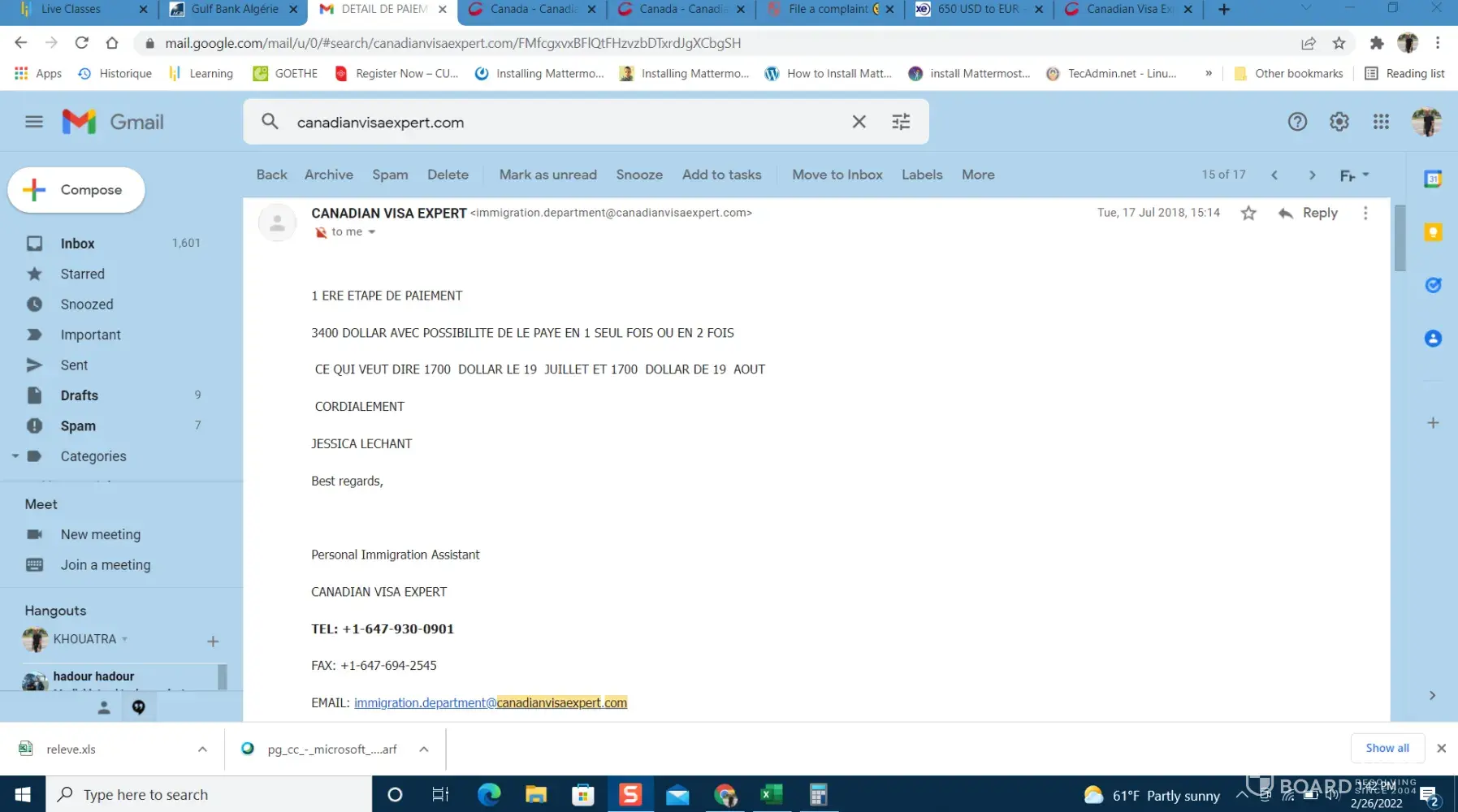 Instantly after finishing the call, I sent him an email informing Canadian Visa Expert that I did not want to proceed with the payment of 2, 250 USD for step 1 of the process. Indeed, I have never asked for it and I requested to cancel any payment that could have been done, I did not get any response from them. In parallel I contacted my bank to block my credit card and to inform them about this incident, my card was blocked but the bank could not interrupt the transaction that has been initiated and I was charged 2, 250 USD = 1909, 37 EUR.