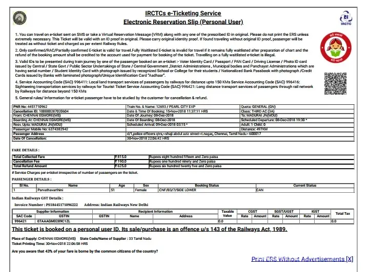cancelled irctc ticket issue