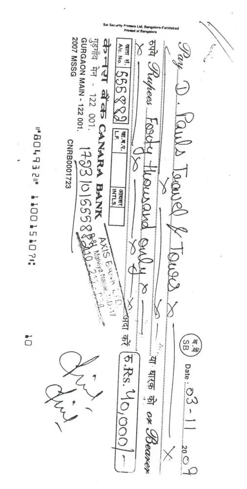I have given a cheque (no - 804932 dated - 3/11/2009 represented on 5/11/2009) of rs. 40'000 /- of yours bank as an booking amount of 6 persons to a holidays package company but few days later I got a call from that package company that your cheque is bounced & when I asked them the reason for bouncing, then they showed a letter from ' axis bank ' saying ' cheque return advice ' & the reason mentioned in that letter was ' insufficient funds '.