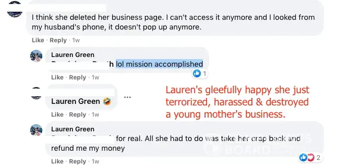 That shows a SOCIOPATHIC side to a human being. TO TAKE PLEASURE and be happy while doing it? It shows exactly what Lauren Green is. A true sociopath. And what is a sociopath perfect at? HIDING HER TRUE SELF! Who takes pleasure, who laughs when she's DESTROYING someone's business. You will see one of Lauren's comments after a friend says "I CANNOT FIND A website, page, private FB or anything about this lady". Lauren gleefully states MISSION ACCOMPLISHED. AKA... she's annihilated this woman completely. Lauren TERRORIZED THIS WOMAN to the point, this woman left FB altogether, even her private FB page. How scared could she get of Lauren Green, of LAUREN'S GROOMING KATY ? ! ? ! Over what? MY GOD! What an evil person! You can only imagine what she did to her employers over time! :(