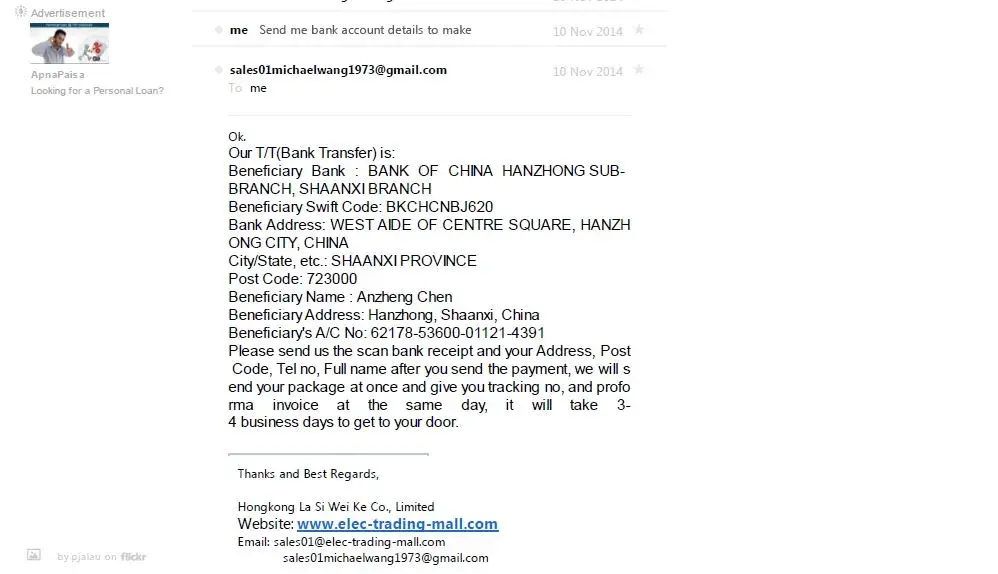Beneficiary Address: Hanzhong, Shaanxi, China