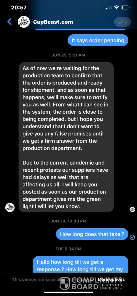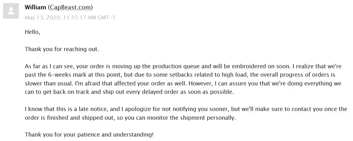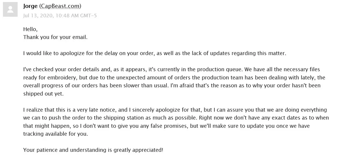 I ordered ONE mesh-stretch fitted hat on April 1, 2020 and have yet to receive my order almost 3 and 1/2 months later (it is now July 13, 2020). When I was first emailing Capbeast about my logo design, they responded to me within 24 hours. Then, as soon as I made my payment, they disappeared on me. I emailed them a month after my purchase and they responded that with corona that the orders will take longer than their stated 4-6 business weeks. So I waited. Then last month, I checked in again TWICE and no one responded. So I asked for a refund. Again, no response. Finally, last week, I emailed them again describing my dissatisfaction with the whole process and TODAY someone responds with the same email content they sent previously. I'm so tired of this. This was supposed to be for my friend's birthday in April and now I'm going to have to reorder from somewhere else. I just want results or a refund. I also called them on their phone number today and of course it says "they have too many customers in line" so to "leave a message" and that they'll "get back to me." I highly doubt it, but I'm going to pester them until something is done!