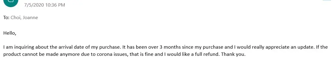 If you're checking here before you buy, you're smarter than me. Do not buy from this company. You're just donating your money to whomever is on the other end of the website. My friend and I both ordered a cap with the same logo, but different nicknames. My friend got a response with my order on it almost immediately, but it's been crickets ever since. No refunds are coming. No product is coming. The only sense of scam related to covid is when this company tells you delays are because of covid.