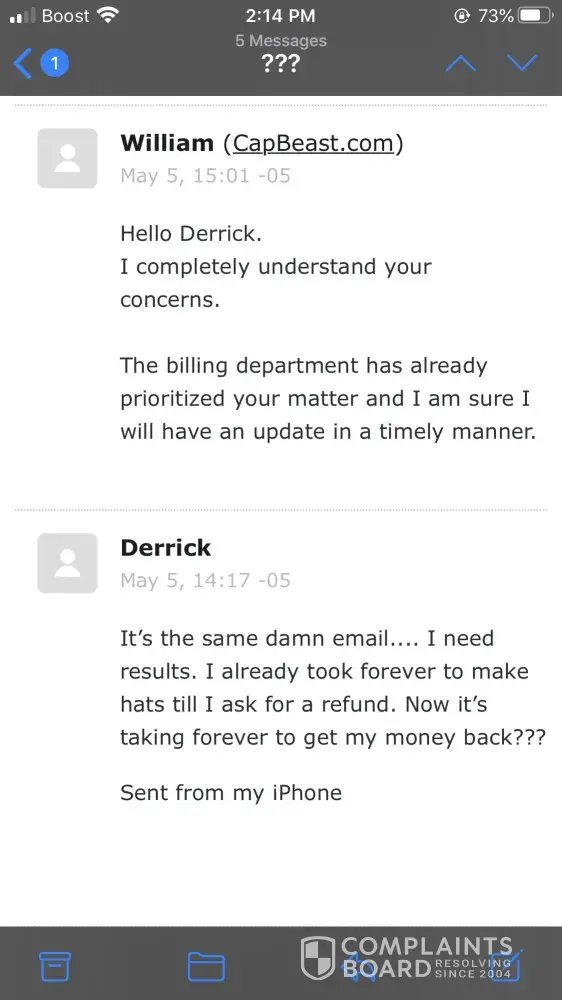Father's Day comes Father's Day passes I finally look up what he purchased on cap beast. About a month has passed since Father's Day I called the company Facebook company they told us that it was because of Covid I've asked for a refund I have not heard anything back after ask for the refund they blocked my messages this place is a scam they should be shamed full of themselves from stealing from people to be quite honest I am very pissed off about this and I want to spread the word about this Internet scam company.