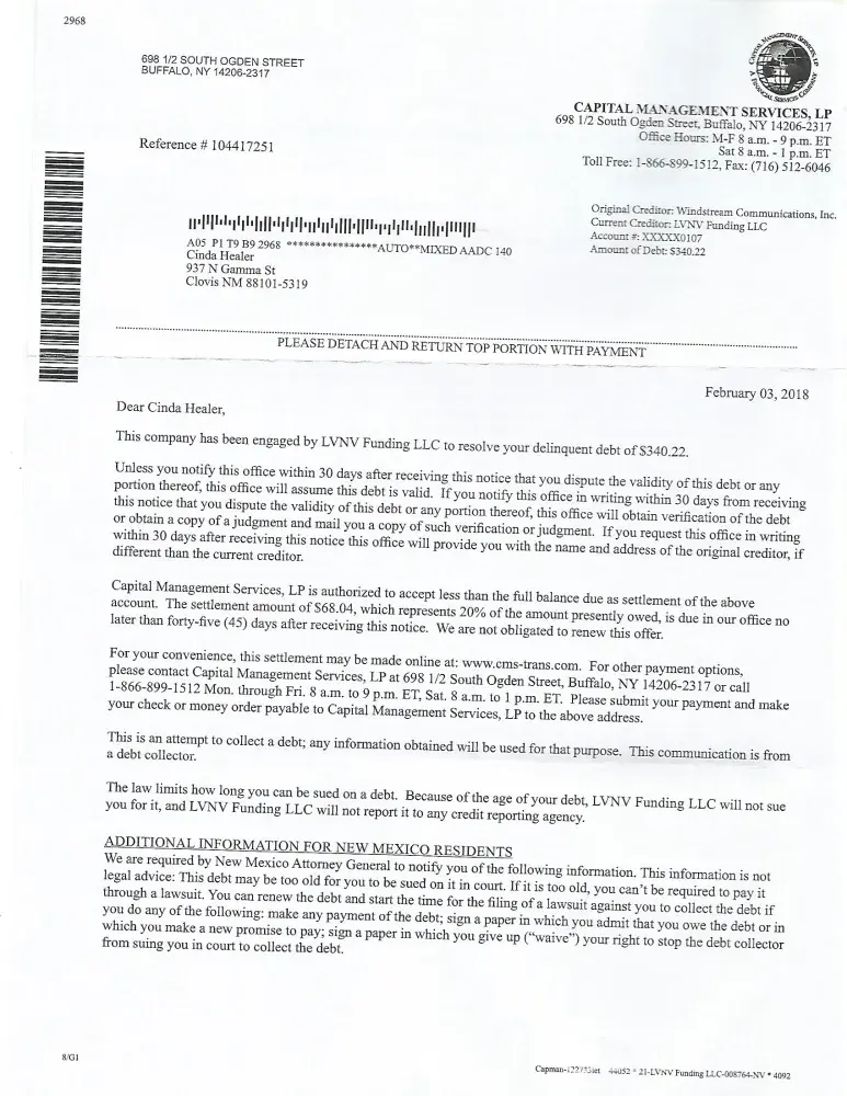 I opened an account with Windstream Communications, Inc. in 2010 with the agreement being $48. a month after installation fees. The first bill was for $88.. I called and cancelled the account. I received another bill for $88. for the following month. I called again and the statements stopped. LVNV Funding LLC took over the account and started sending bills. The increased the bill to 340. and changed the original date to 10/2012. The bill has been taken off my credit as of 5/2017. Now Capital Management Services is starting to reinstate the debt. I have called them this afternoon at 2:24 pm and informed them not to call me and that I will not pay them anything. It was on a recorded phone call. I received a letter stating that unless I responded within 30 days they will make this bill active again. The letter was dated 2/3/2018. I am responding now. Thank you Cinda Healer