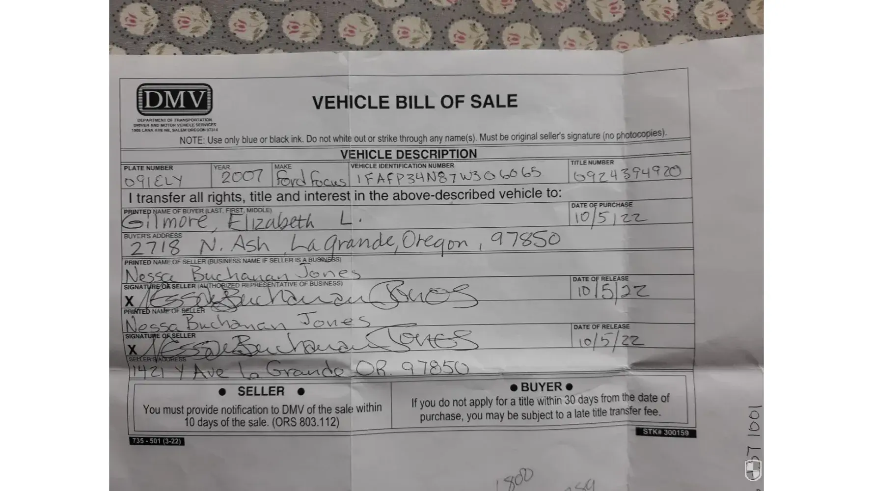 *I applied for a license replacement in the state of Oregon using my bill of sale from Nessa Jones.