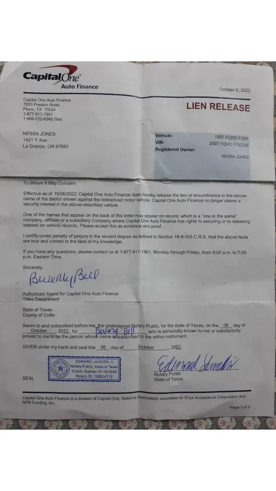*Nessa then immediately called Capital One again and requested a correct Release of Lien form be sent to her.