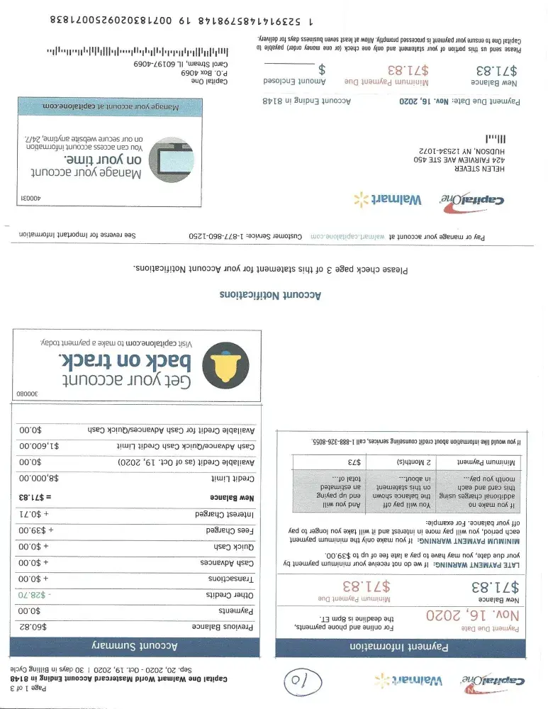 Name:Etta R, Hicks Address: 1401 Summit Avenue Jackson, Ms 39212 Today I received a bill and do not have an account with your company nor have I ever requested a cedit card. I have been unable to get adequate help by phone, so, I have mailed the statement back to CapitalOne with the instructions to delete my personal information. My name and address is above. Thank you for your immediate attention.