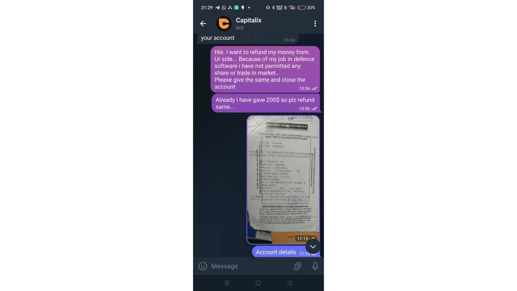 So then I was call to her so not reachable. But I had send msg through telegram Which is mentioned ijn capitalix application. So she said ok it will refunded. Its in process.