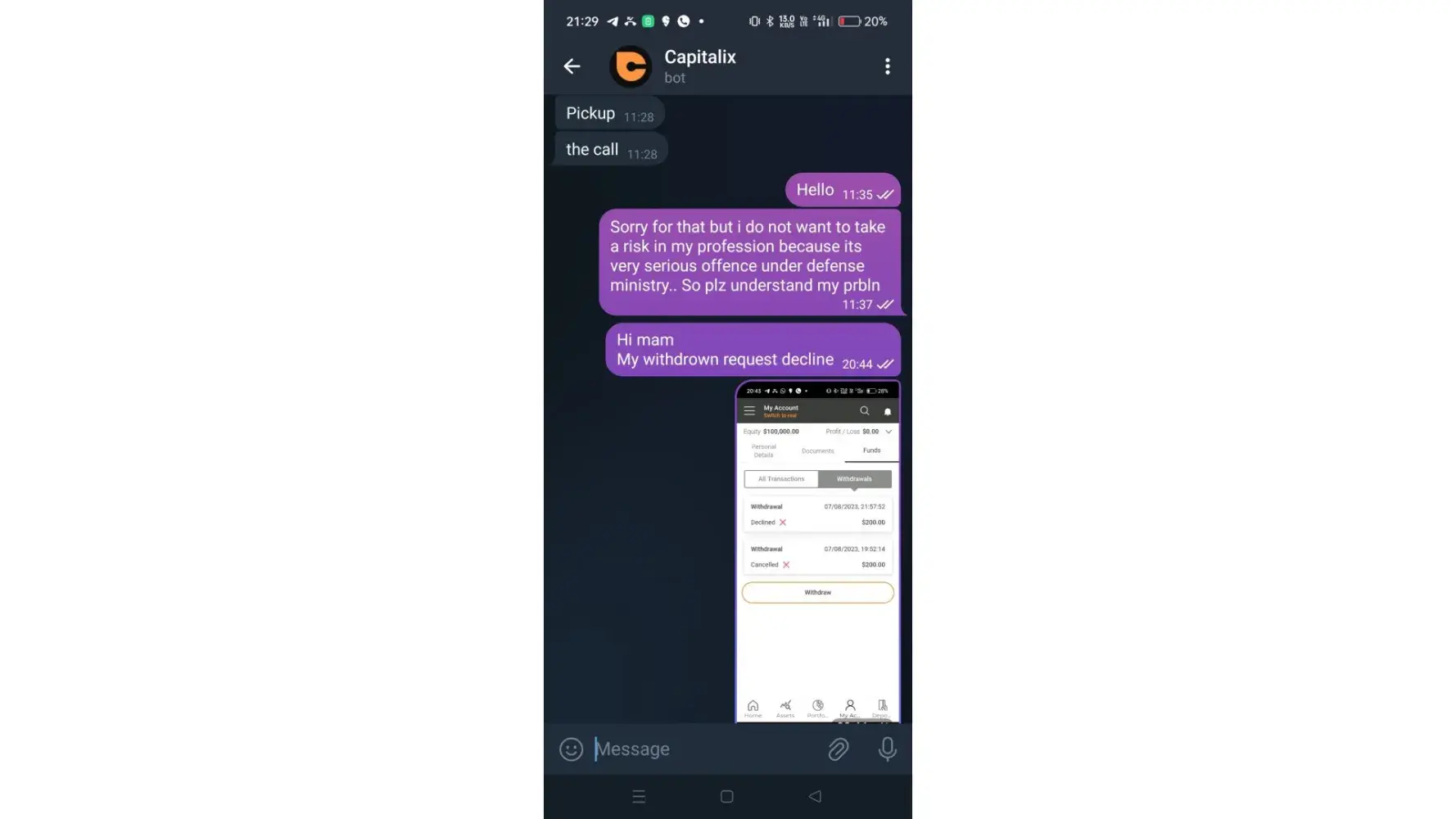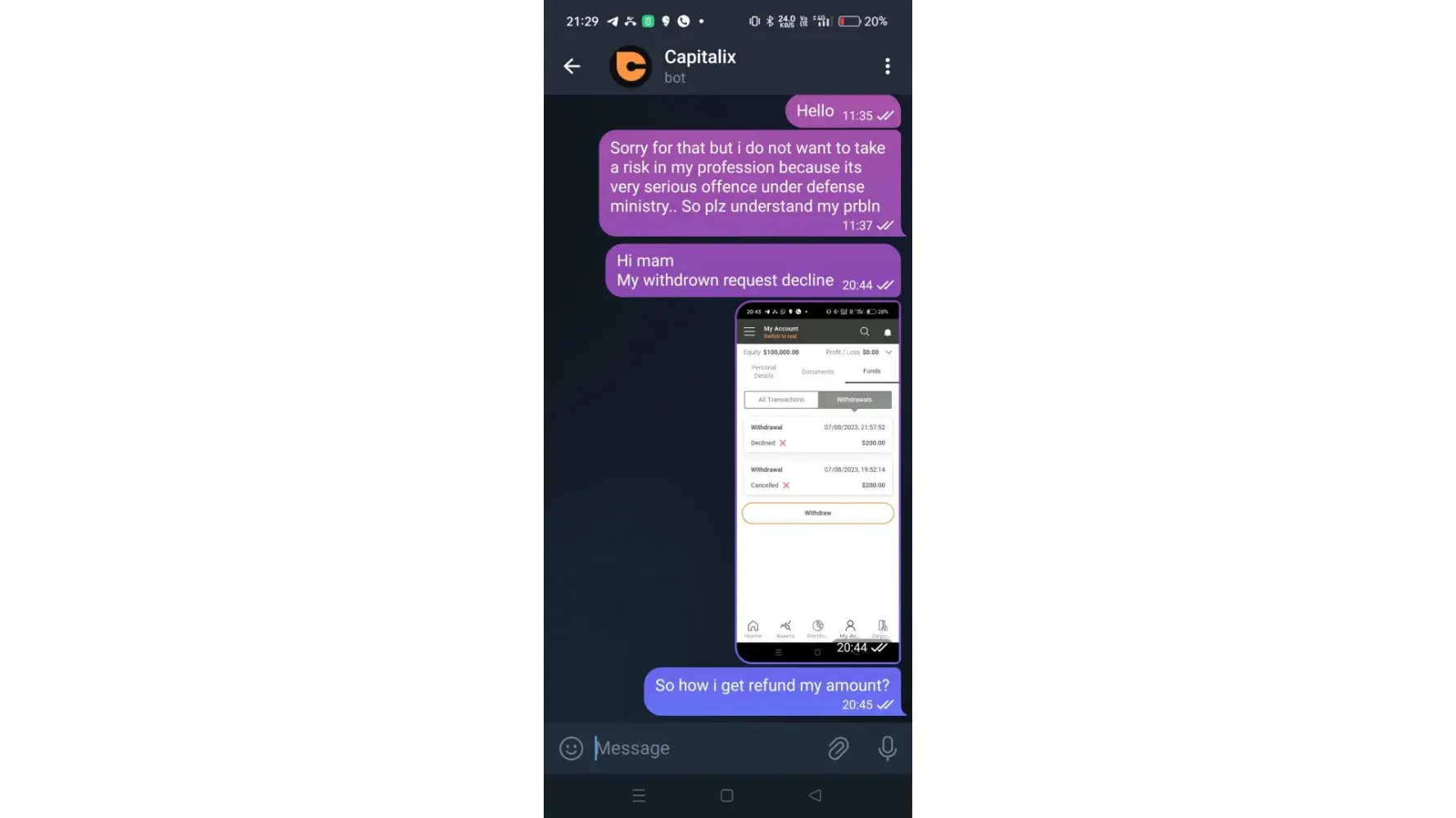 As per personal manager i opted for trade and later I asked for withdrawal the amount, he was rude and cut the call. Later i complaint through mail and personal manager called me and asked to share cancelled cheque and I did as per his instructions and now I see withdrawal status as declined. And now perosnal manager is also not responding me in telegram since 6th of March-24 and no other option also to connect with Capitalix team. Please help me in getting my amount back.