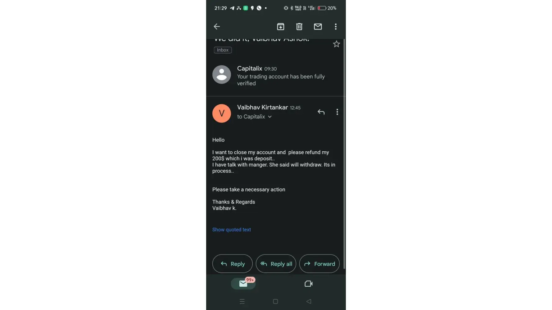 I'm seeking appropriate action to be taken against Reyan for his behavior. It's disheartening that he exhibits no empathy despite causing substantial losses to customers. Additionally, his assertion that my trades will be reinstated upon transferring a specific amount within a month raises doubts.