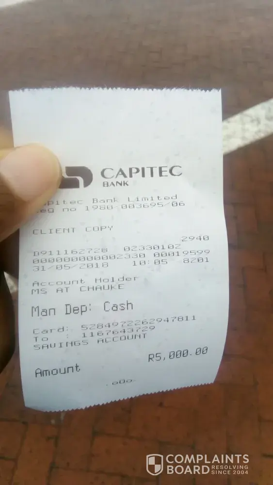 I have been deposit money to him that amounts to r12000 now through his capitec account thinking if anything happens I can have the price to the banks that I have posted the money bt now capitec is habitating the froud by saying we cannot do anything because its cash deposit. All am asking is for capitec to atleast freeze the fraudulent's account so that I can start the process of getting him arrested at stop stealing other people's money