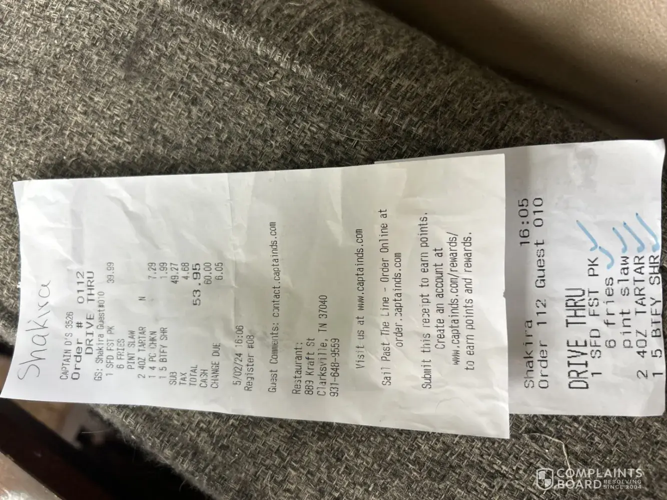 I ordered the Ultimate Feast on May 2nd, 2024 @ 16:06pm at Captain D‘s on Kraft Street in Clarksville, TN 37040! Order #0112, drive thru. Skakira Guest #010, Register 8. I waited about may 10 min or so on the Meal I ordered. I live 2 min from this location if that. I got home fixed everybody’s plate. French fries and hushpuppies were old, cold and...