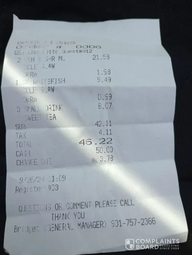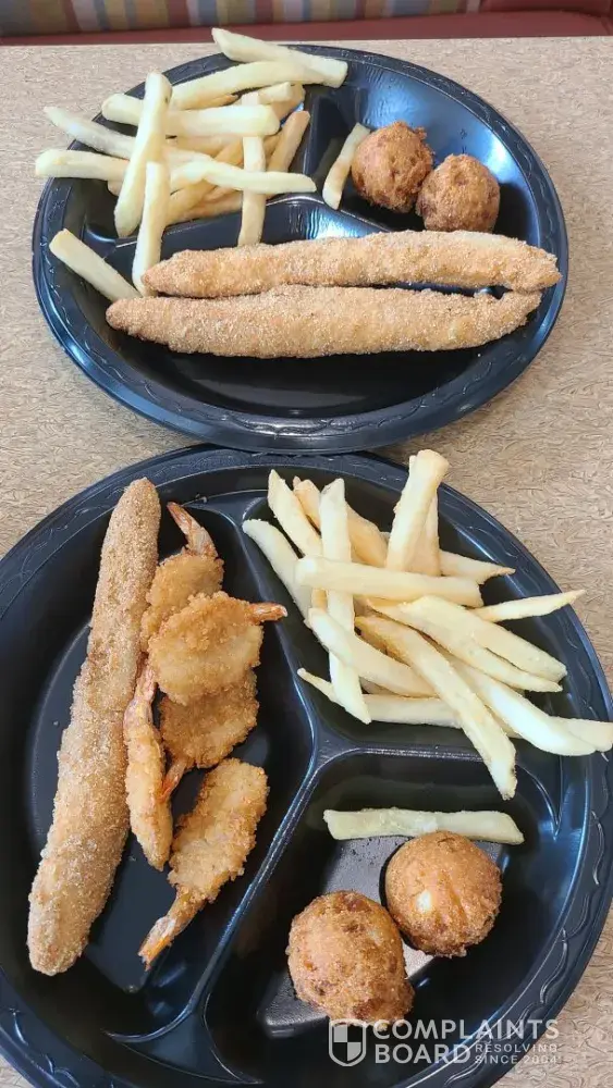 I ordered the Seafood Feast at 3313 Western Branch Blvd, Chesapeake, VA #331710 and not sure what we got the Fish looked like some type of planks and did even taste like fish. The Tarter Sause was spoiled. Ended up throwing the Fish Away, only ate the Shrimp, Sides and a couple pieces of the Fish. Been going to this Captain D's for years -- This was the worst food we ever got from there. What a waste of $44.49