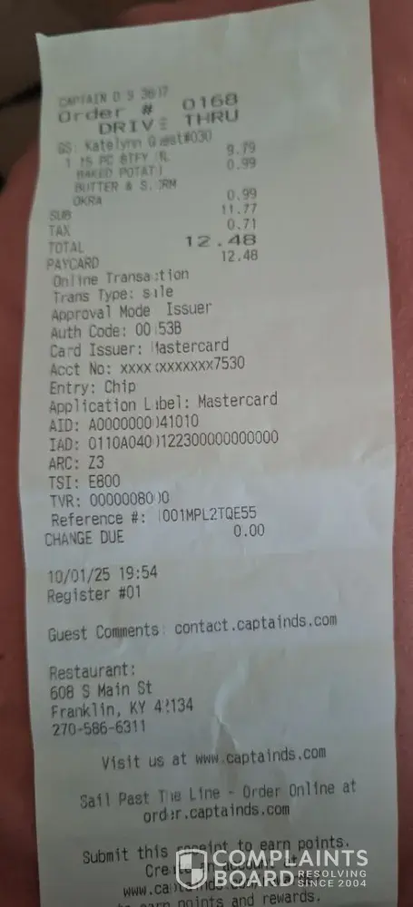 8-14-24 7:00pm. I just went through the Captain D drive through in Hendersonville, TN on Main St.. I had a bad experience 2 weeks ago with receiving fish and chicken dinner that had been fried in very old grease. I could not eat it. Even the crust was a brown color with flakes of burn through it. I decided maybe it was a bad night so decided to try again...