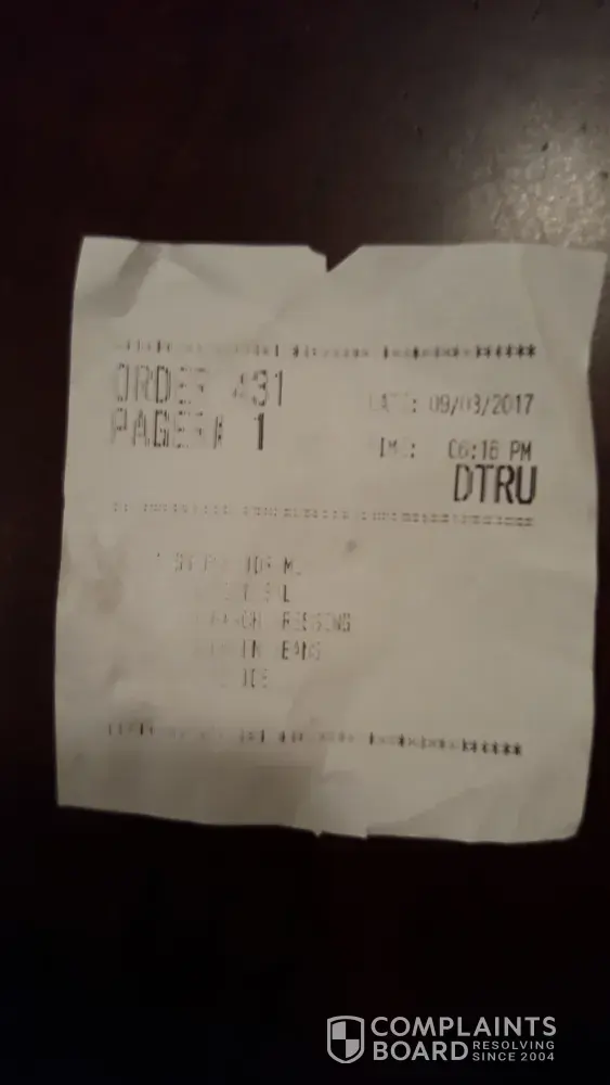 September 2, 2017 I purchased a fish meal with a side salad, green beans, and a small sprite with no ice.