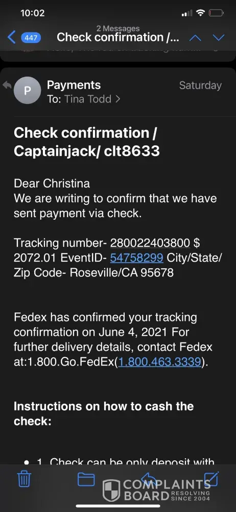 On April 10 I requested a 2500$ withdrawal of winnings by which a deposit by me was made using a bonus code. Finally received on 4th of June a confirmations check for 2072$ was fed ex to me with tracking number. The check was delivered to an address in another city that I do not live in and signed for by somebody I do not know.. not only is this bad but I contacted support and my casino host to receive no replies.. so now some stranger has my 2072$ winnings .. I would've done a wire transfer but conveniently they weren't transferring to my bank at the time, So not only did they do a coupon reversal and take a bunch of money out of my winning balance- this is done when you reach play-through limit is reached with no warning .. but yet when I cashed out they took the amount extra above the deposit that they gave me. (I.e. 280%) Then send it to someone else… how long will it take to get fixed? 2 months wasn't enough to wait to get the check ? Now they've screwed up and I was hoping it would come before my bday on the 21st. Which it would have ..