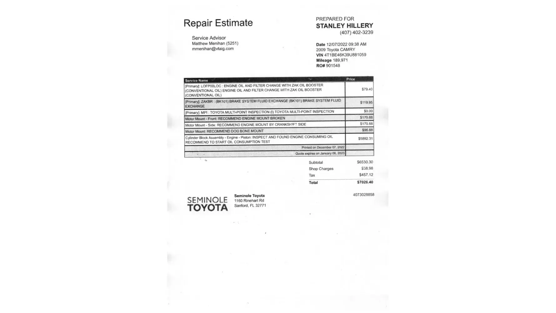 On 09/13/23, my car was taken into Seminole Toyota for service. I was advised that in addition to the oil change, it needed the Brake System Fluid Exchange, which we had they do. Upon leaving my service advisor said the Dog Bone Mount needed replacing due to its wearing. On 9/17/23, I was emailed the Multi-point Inspection report, which included further...