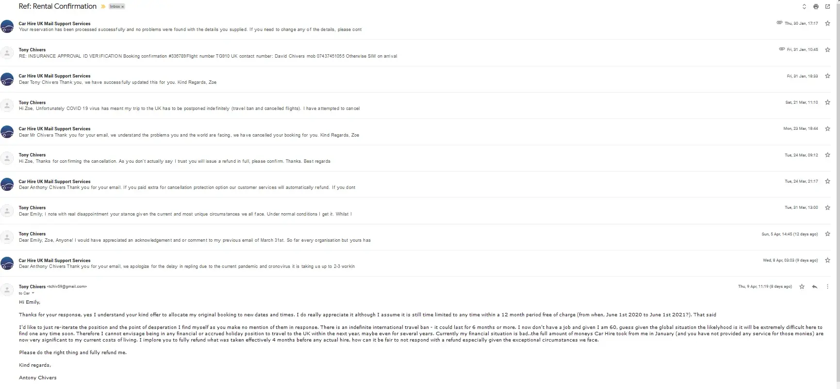 Car Hire UK also known as Elsinore Garage & C0. I reside in Australia. Refund request due to Covid 19. Website booking made Jan 31st and full booking fee of $622.90 was taken directly from my credit card. The booking was for Car hire from 1st June 2020 to 27th June 2020 March 21st I cancelled booking on line due to announced travel ban and was locked out...