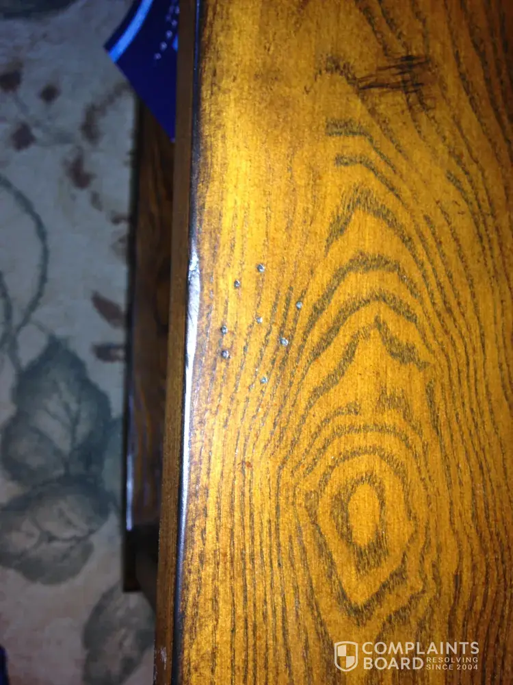 On 6/20/17 I purchased a wooden rocking chair as a gift. When the box was opened, we noticed tiny holes in the arms and back that were mirrored on the other side. They were so perfectly placed, that it looked like some sort of clamps had been placed on the chair.