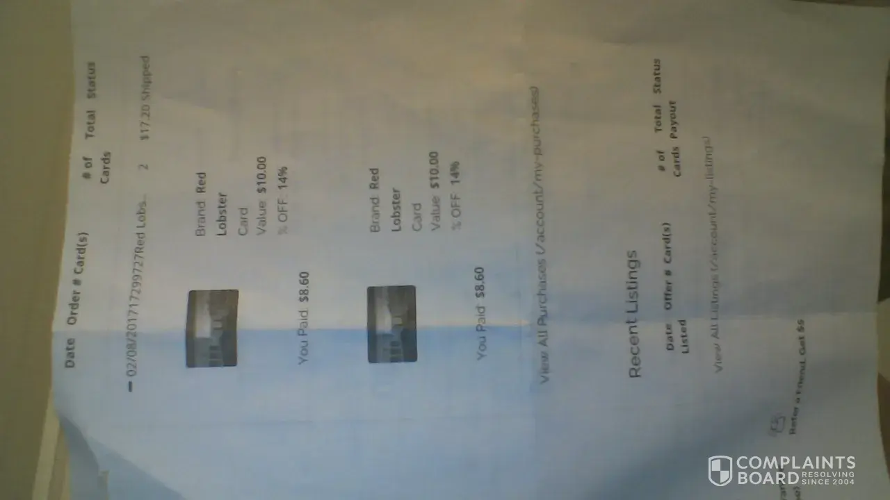 On February 8, 2017, I bought two Red Lobster cards and gave them as a gift. Spoke to one of the person(s) recently and was told she did not use it because she thought they were BOGUS. The total cost was $17.20. My request is that you please look up the cards and resend them to me so I may use them.