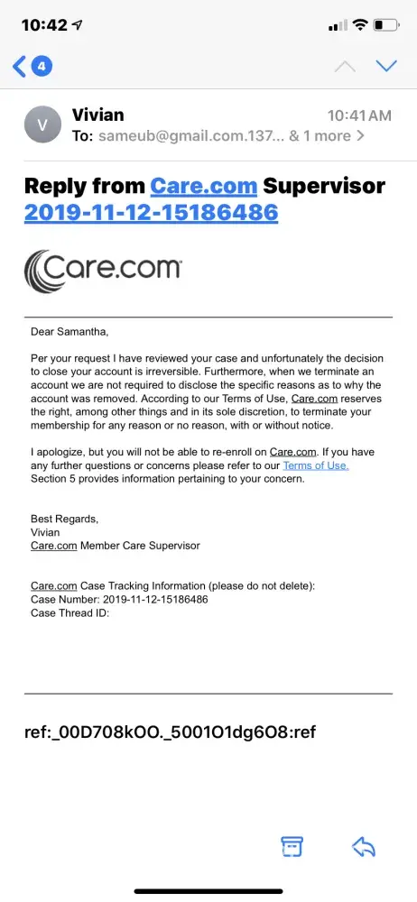 I had a care.com account for a long time and I even paid for it, this was my only job. My account was terminated and they didn't tell me why. My only guess was a parent who hired me at first but I told her at the interview that the same week I was going away for 3 days and that those 3 days will be the only time I'll be away for the next however many months she needed me and she was mad that i couldn't start that week. I disclosed in my schedule and to her that I wouldn't be able to but she was upset and I tried to make it better but there was nothing I could do about it. Next thing you know my account is banned and I lost any sort of job I could've had. I tried talking to customer support and got nothing. That was 2 years ago I thought maybe now I would be able to sign back in but nope I guess it's a lifetime ban lol and there's barely any other sites that have actual job listings. Sittercity has nothing in my area same with the other ones. There should