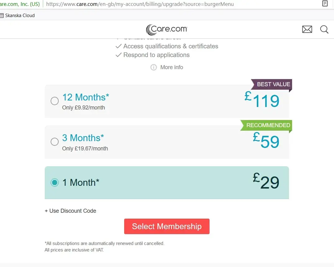 Care.com is a website that allows you to search for care, however, in order to be able to message people you need to buy a package. What was looking like a one time package of 45 pounds, it was then automatically converted in a monthly subscription for the same value without being clear of that.