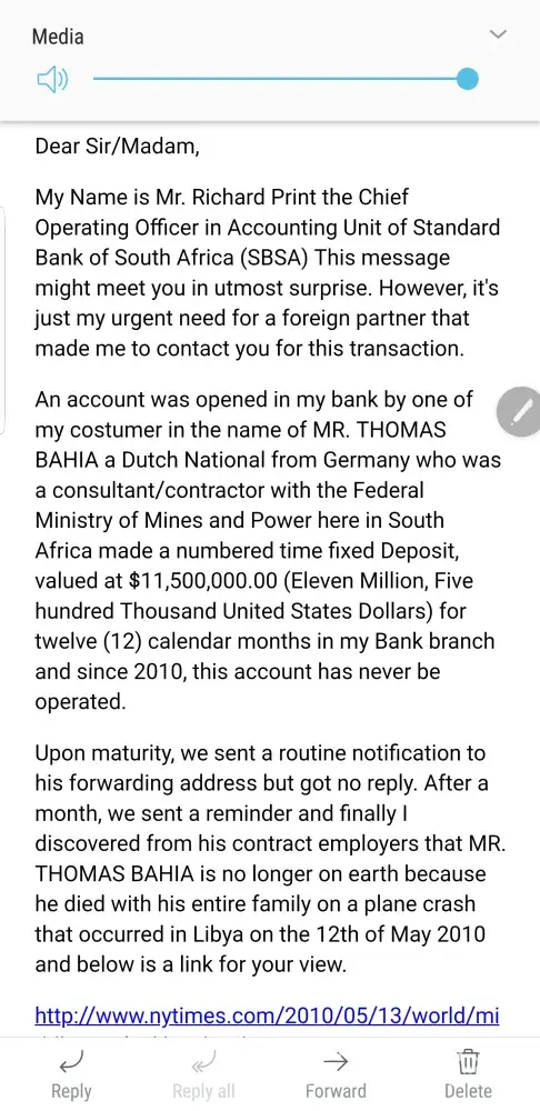 A Richard Print has sent me an email about a family that died in a plane crash and that he is giving me 45% and he is keeping 45% and 10% for expenses of 11 and a half million dollars. Who is this man Richard Print? Is he for real?