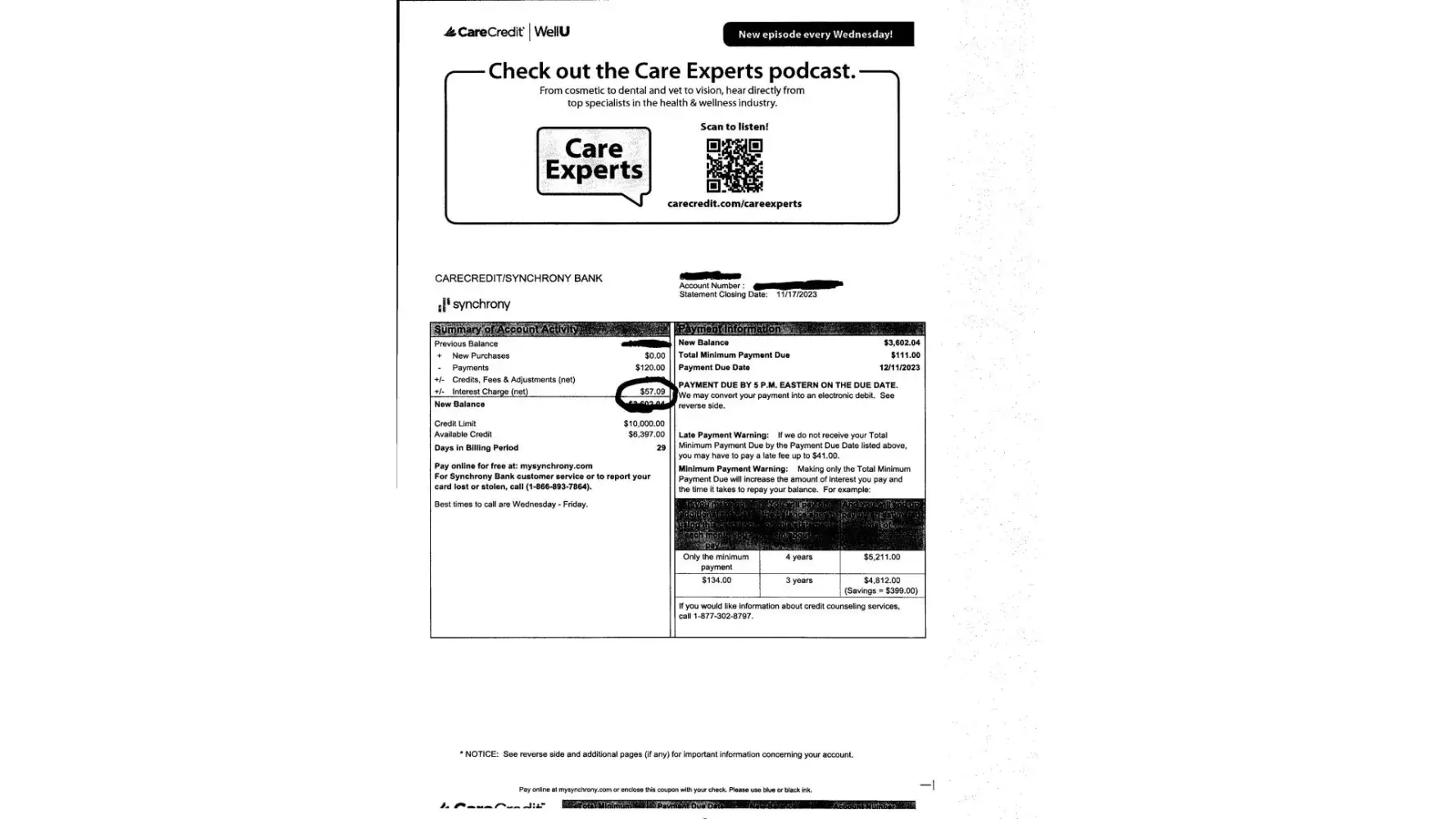 My wife was told that there is promotional financing for 48 months on the care that she credit card that she received in October 2023. Well we paid the bill in November and did not notice the interest of $15.95, so when we got the bill for November I looked at it and noticed there is a interest charge of $57.09 . So I told her we should go to the Credit union and get a loan to pay this off and we did the card got payed off and my wife contacted care credit and they said we do not get the promotional financing because they said the dentist that she went to turned the promotional financing off which I know they they can not do that care credit is where they offer the financing so buyer be aware of this crooked company they are Crooks