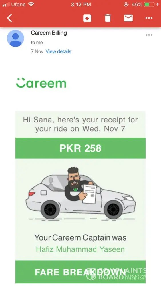 I used cAreem service GO today and received a Bill at my email. Which is as under.