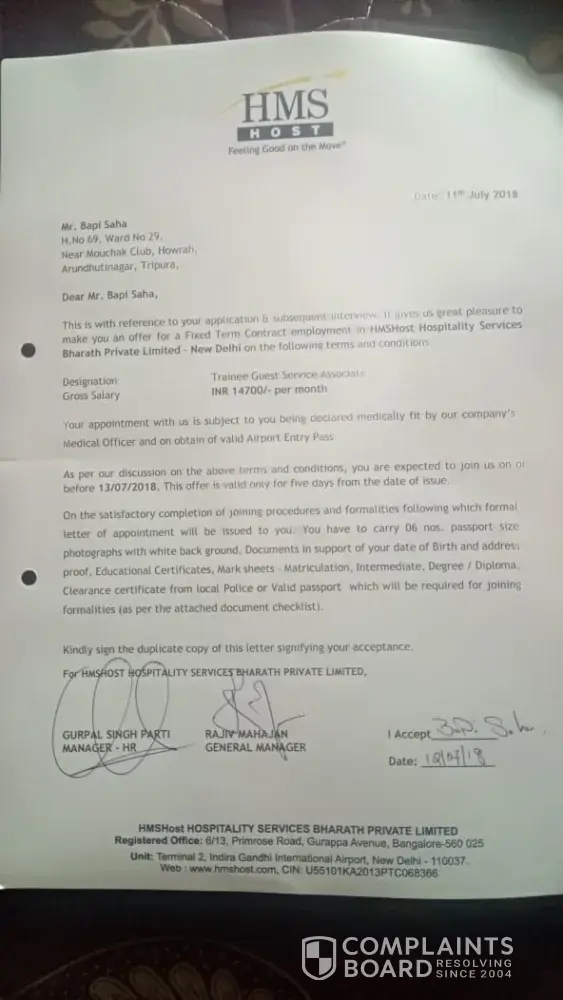 then mujhe Delhi me veja gaiya he joining k liye. eha ake mujhe "HMS HOST" me job mila he, post: Trainee guest service associate.