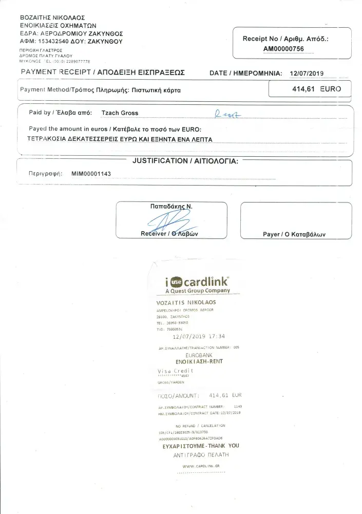 As you can see from the enclosed receipt (No.AM00000756) we were charged 414.61 EURO by the rental company in Mikonose in Greece on top of that you charged 526.73 IL equal 138.6 EURO which we haven't been refunded, so what am I supposed to do?