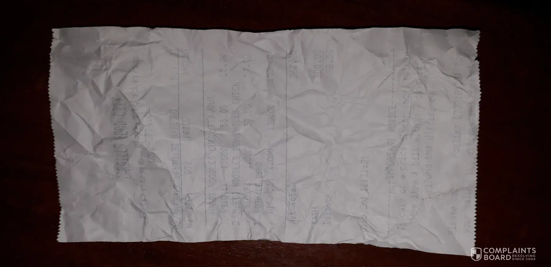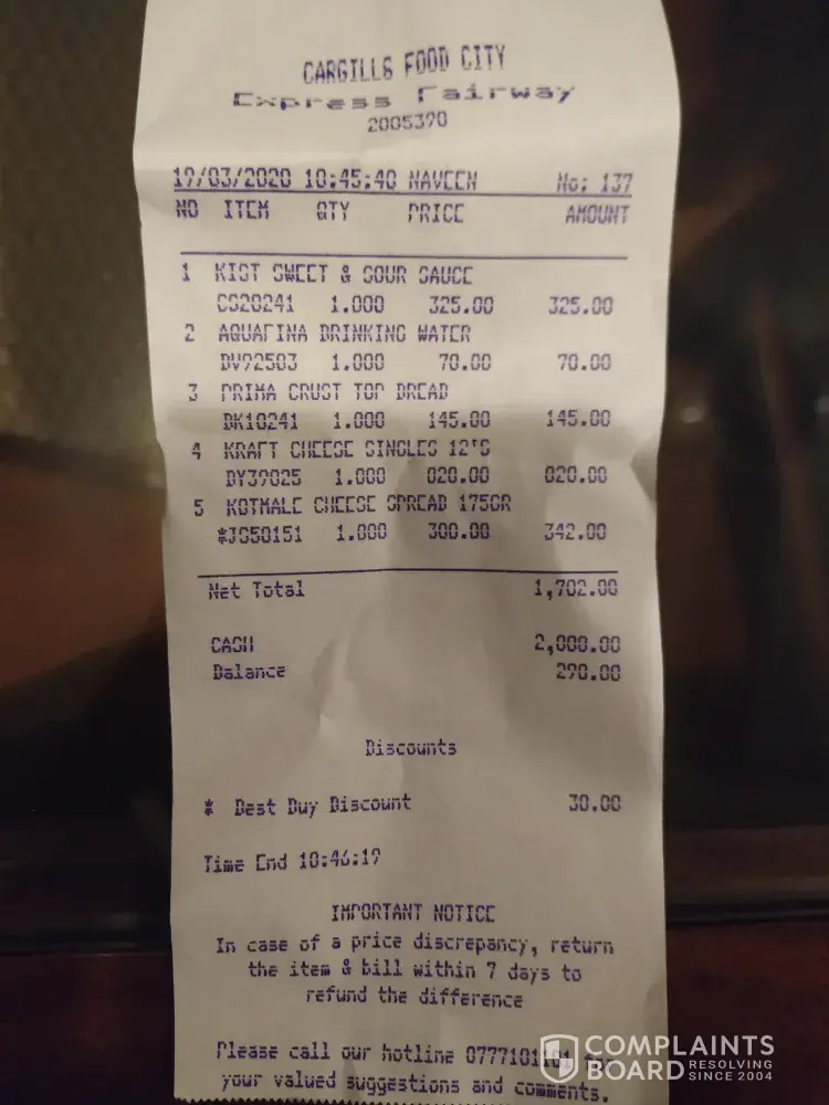 Above details as appears in my bill. I was surprised by seen how this mc cargills food City cashier treated the customer in front of me. That person only purchased a small packet of biscuit and gave 500. This cashier rudely asked for change and when that person unable to provide changes cashier treated him disrespectful way. Throw the balance cash at him. Didn't bothered to give him a bag. Bill fell off and didn't bothered to hand it over