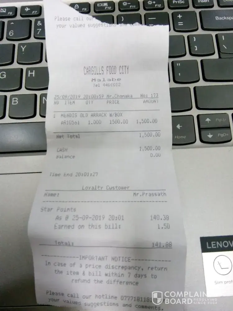 This is to bring to your notice that Yesterday 25th September 2019 i went to Cargills Malabe (Near The Bust Stand Malabe) and i brought a bottle of Old Arrack which is Rs.1500.00, before i gave the Cargills Loyality card he has billed,