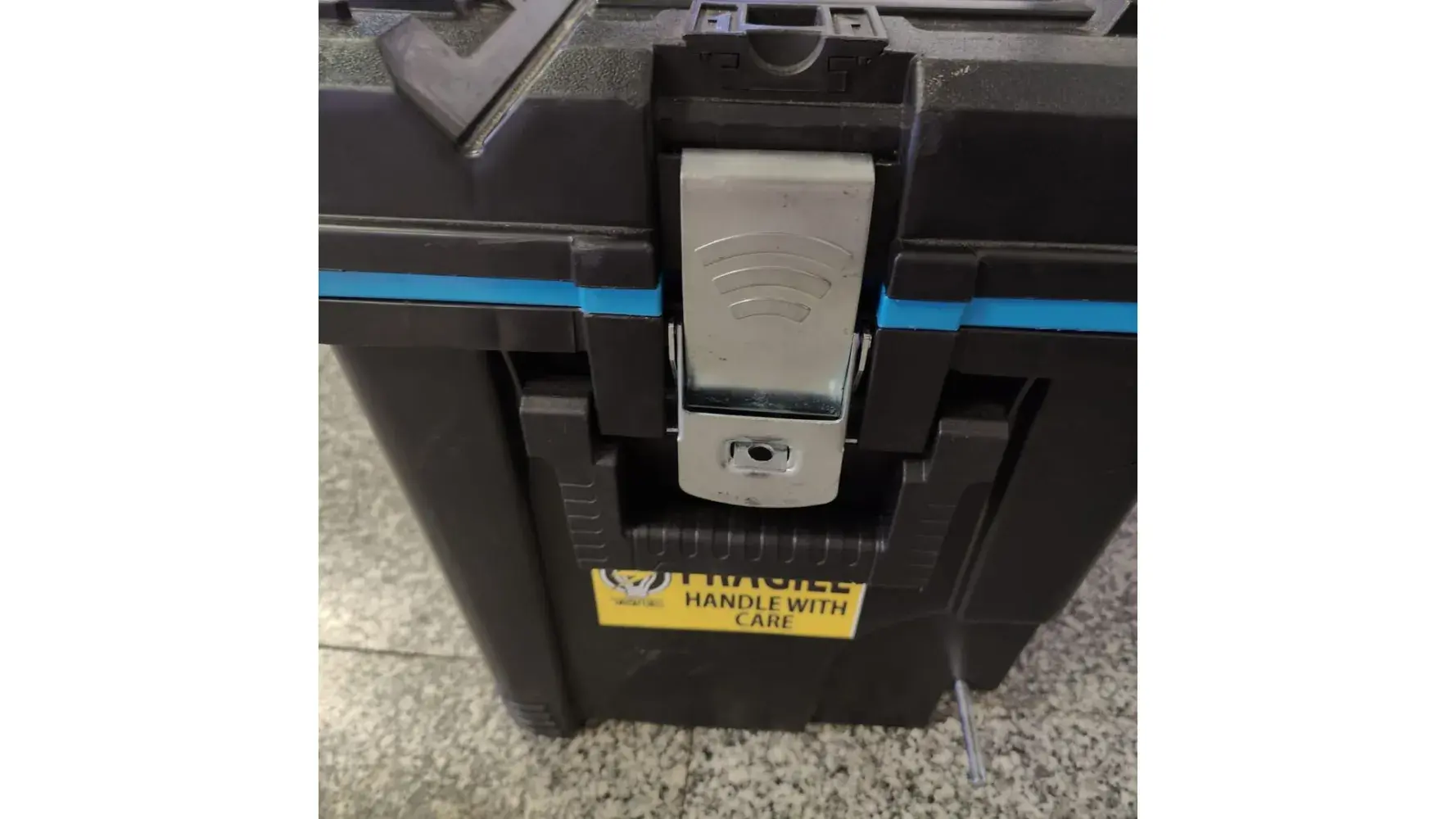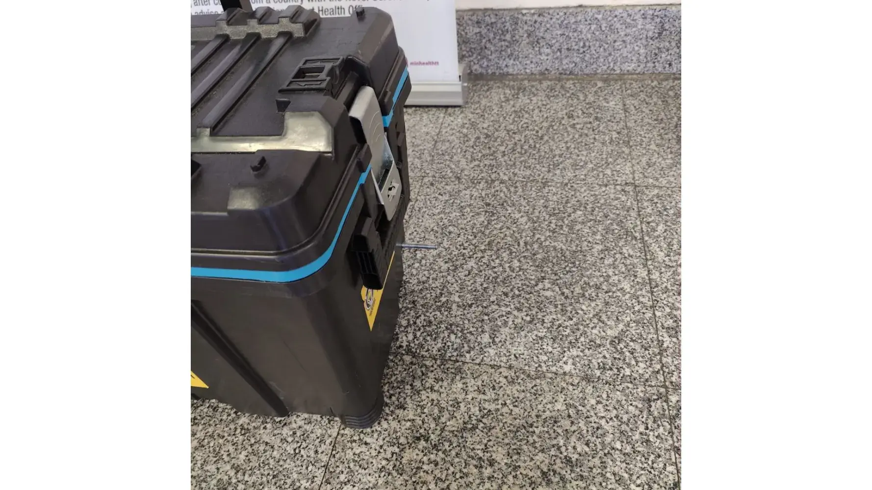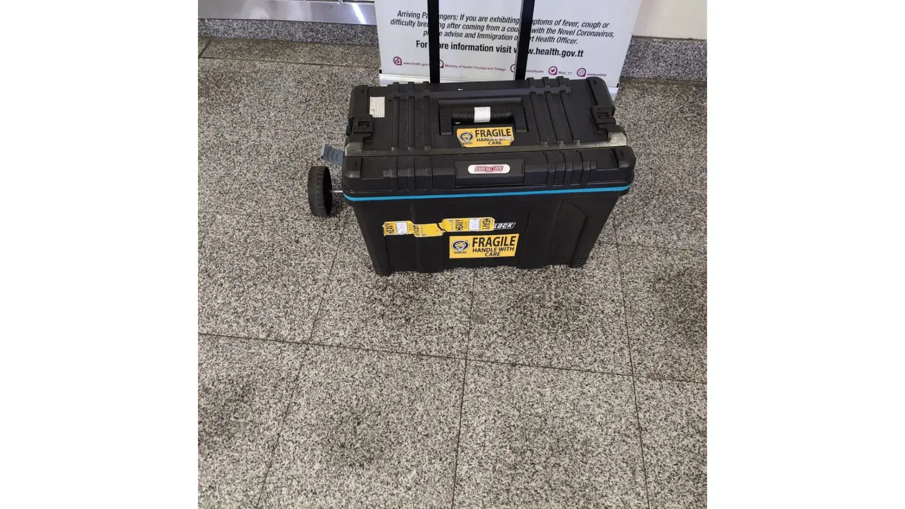 On the 4/5/23 I returned to Piarco International Airport on flight #BW1531 after carrying out my work duties @ Tobago. Upon receiving my baggage around 7:20pm I noticed baggage tag# BW318577 with one side of the rolling wheels broken off and missing, one side of the box lock missing and the box opened. All the materials and equipment inside the box was retrieved.