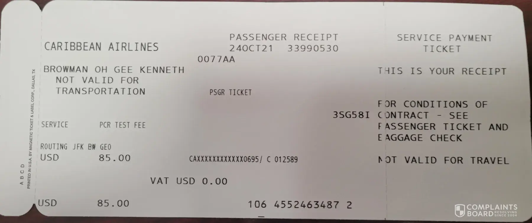 I previously travelled on a Caribbean Airlines flight # [protected] from JFK to Guyana on Sunday October 25th. I was required to pay $85 for a PCR Test The clerk give me a sticker in my passport that indicated that I should pay for a test here or in Guyana a courtesy of Guyana.