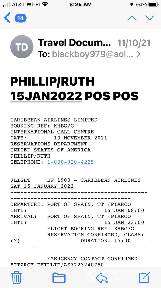I booked a direct flight with a Travel Agency, Caribbean Airlines reservation # 4AVLN9 (BW). The flight was to depart from YYZ Toronto, to Georgetown Guyana on December, 25th, 2021at 10 am. All went well on this portion Flight # BW 0613