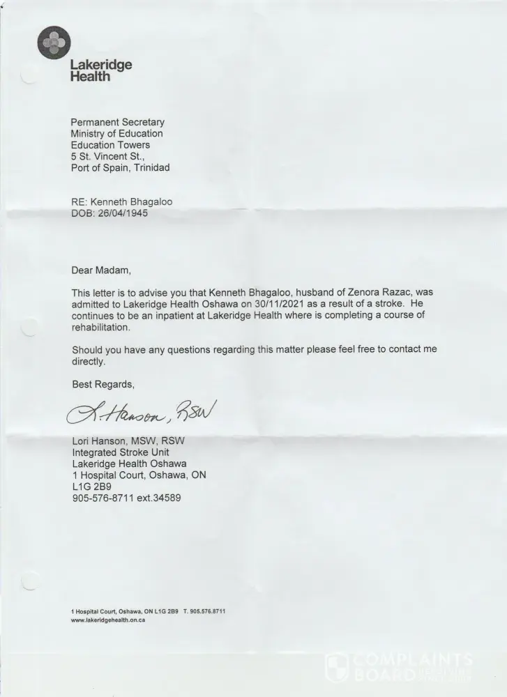 My husband Kenneth bhagaloo has suffered a stroke on the 30th November 2021 and as such I cannot return on the 6th January 2022.